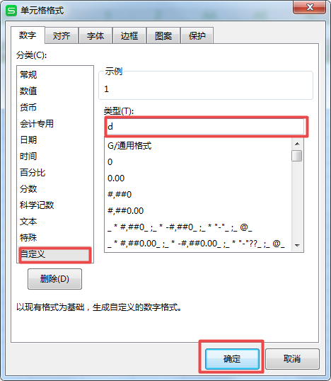 第六步,接着就会弹出设置单元格格式的窗口了,我们选项界面左侧最下方的【自定义】选项,然后在右侧的【类型】下方输入【d】,然后按下界面下方的【确定】按钮。