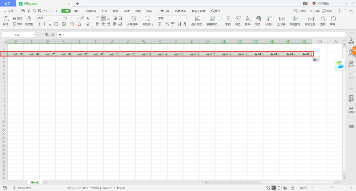 第三步,然后选中D3单元格,向右填充到表格的AG单元格。