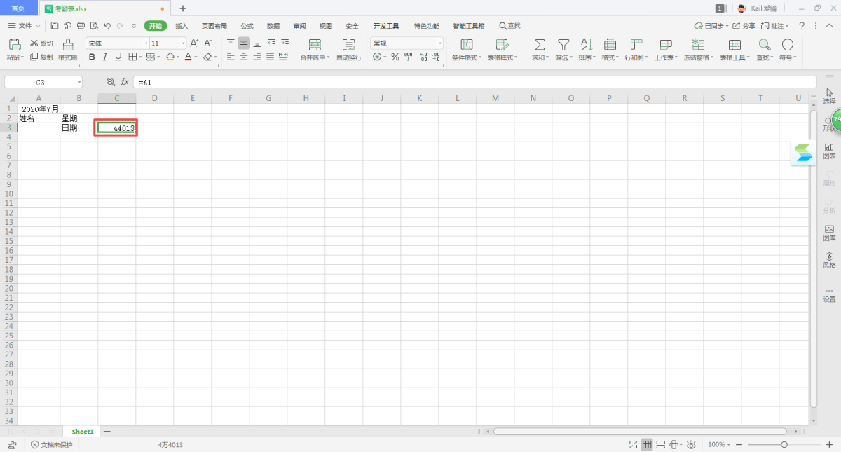 第二步,然后在C3单元格当中输入=A1,在D3单元格中输入=C3+1。
