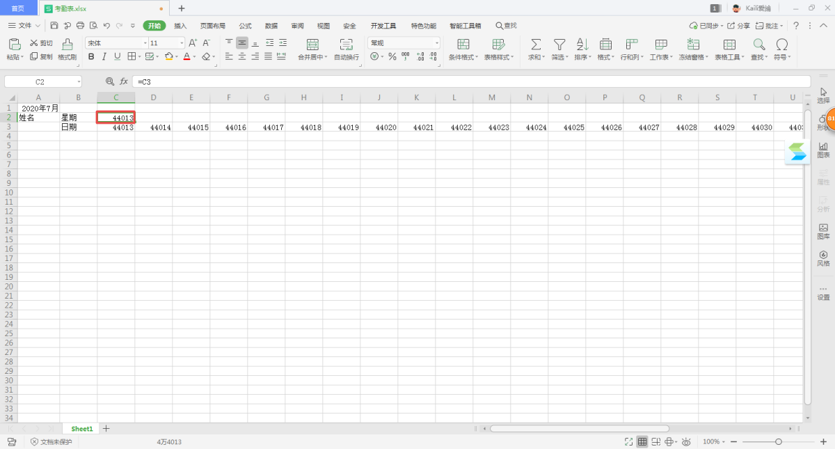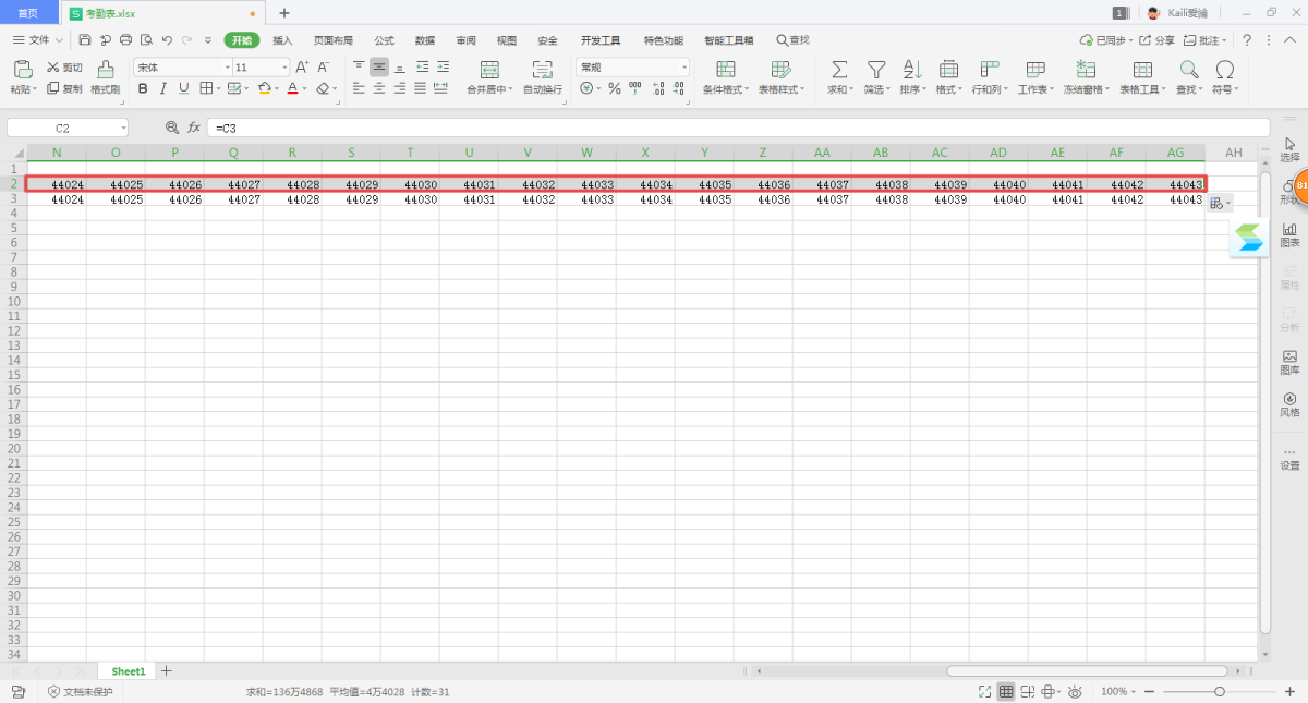 第四步,接下来是星期的填充。在C2单元格当中输入=C3,然后选中C3单元格向右填充至AG单元格。