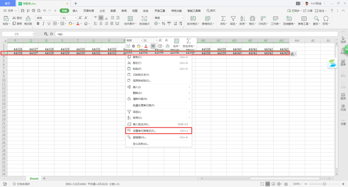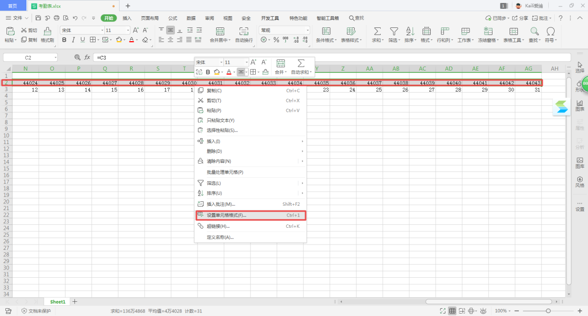 第五步,下面我们需要对单元格的格式进行设置。选中C3单元格,然后在键盘上同时按下【Ctrl+Shift+→】按键,选中其后面的单元格。然后鼠标右键,选中【设置单元格格式】选项。