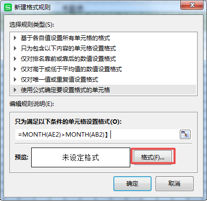 第十二步,在弹出的【新建格式规则】窗口当中,选择【使用公式确定要设定格式的单元格】选项,接着在【只为满足以下条件的单元格设置格式】下方输入【=MONTH(AE2)>MONTH(AB2)】的公式。