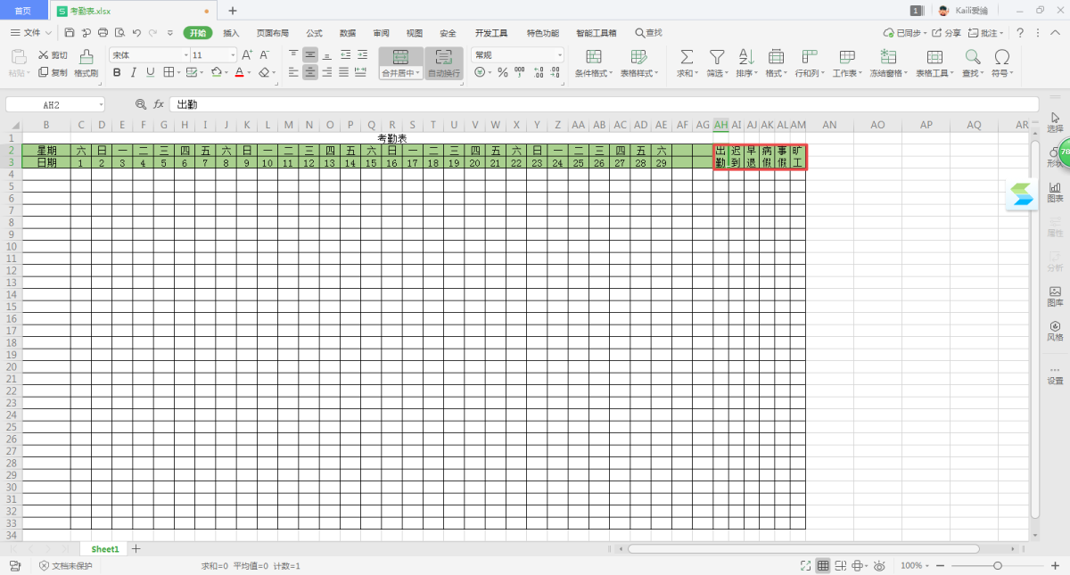 第八步,接下来,我们对考勤表进行美化。根据自己的实际需求,来给考勤表表格填充颜色、居中对齐、添加边框等等。
