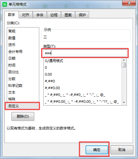 第七步,用同样的方法选中星期一行的数据,然后鼠标右键,选择【设置单元格格式】,接着在弹出的【设置单元格格式】窗口当中,依旧选择【自定义】选项,然后在【类型】下方输入【aaa】,并点击【确定】按钮。