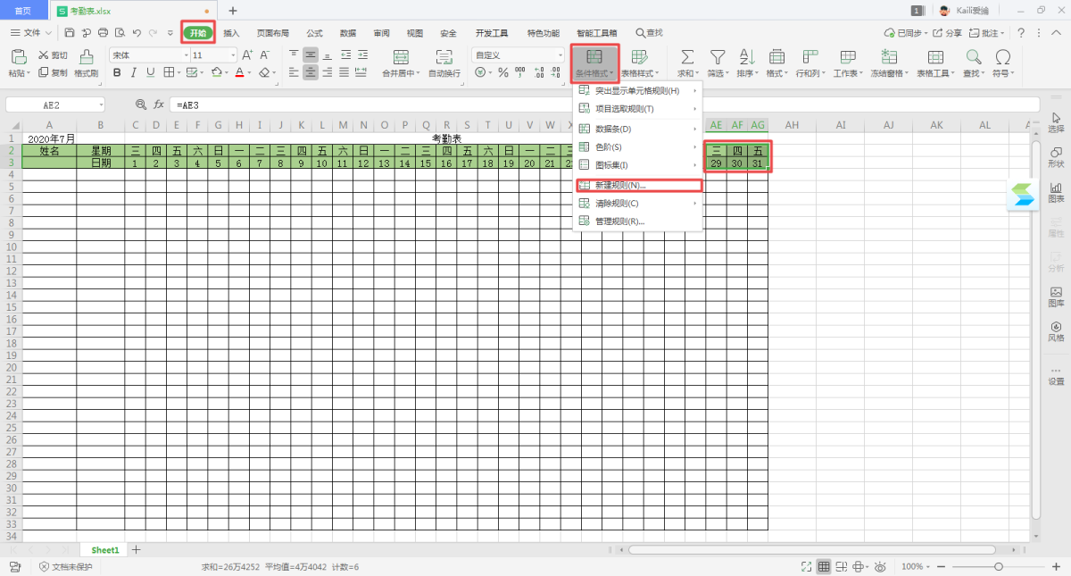 第十一步,接下来我们就需要将多余的天数进行一个隐藏。首先,选中表格当中的最后面的三个单元格,然后在工具栏上找到【开始】选项卡中的【条件格式】功能,然后选择【新建规则】。