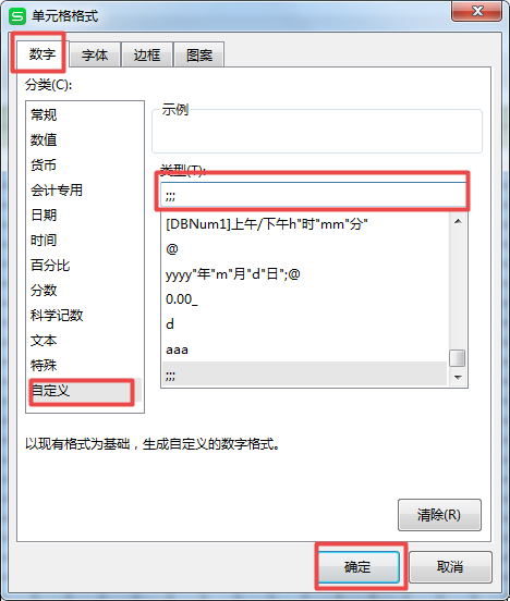 第十三步,接着点击【格式】按钮,在弹出的【单元格格式】窗口当中,选择【数字】选项卡,然后点击选择【自定义】,接着将【类型】下方修改为【;;;】,最后点击【确定】按钮。