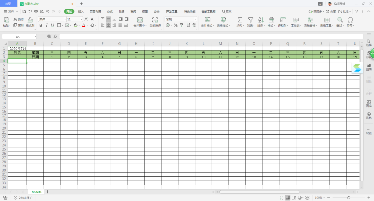 第一步,在电脑上打开WPS程序,然后新建一个Excel表格。在表格当中,我们首先需要做的是日期的填充。首先,在单元格中输入日期,添加姓名、星期和日期信息。