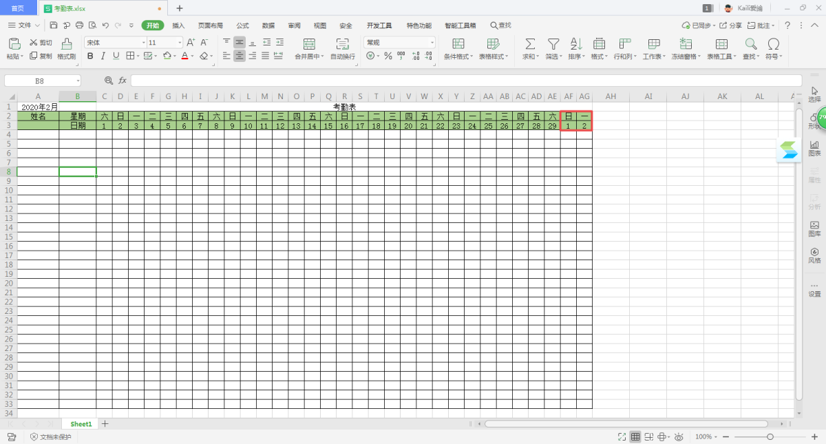 第十四步,接着,我们将考勤表的月份进行修改,就可以看到多余的天数已经被隐藏了。