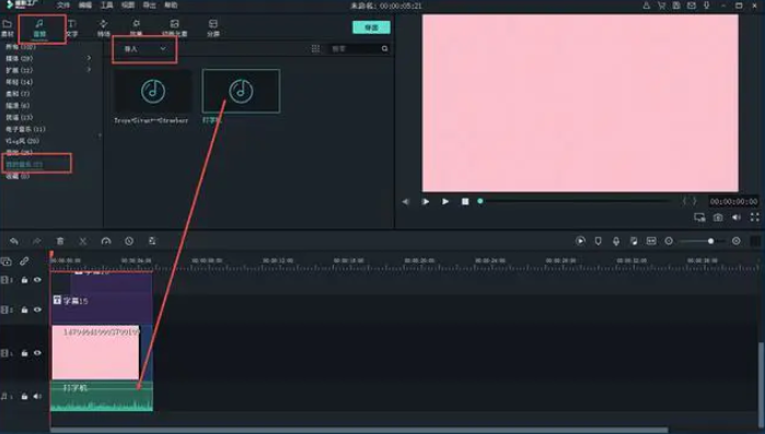 添加打字机音效。先在网络上下载打字机音效,导入到媒体库之后,添加到片头对应的音频轨道上。