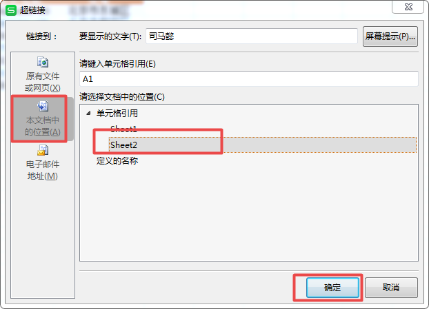 第三步,接着就会弹出【超链接】的设置窗口,在此窗口当中,我们将【链接到】的位置选择为【本文档中的位置】,然后在【请选择文档中的位置】中,选择【Sheet2】,然后点击窗口右下角的【确定】按钮。