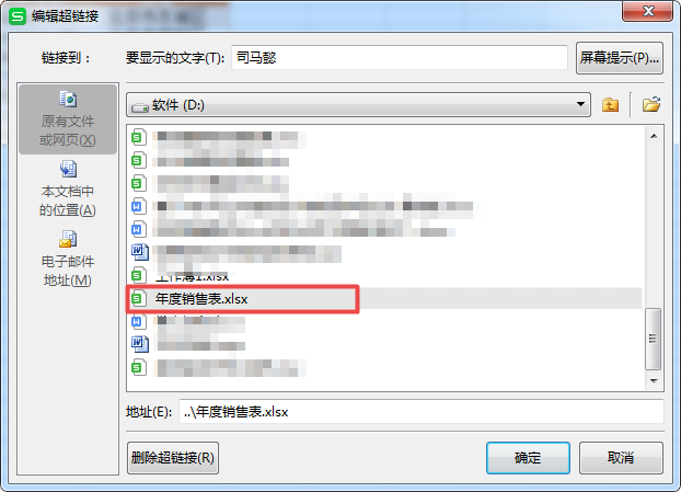 当然了,单元格的超链接我们还可以设置为电脑中的某个原有文件,比如具体的某一个表格,设置好以后,点击该单元格就可以自动调整到另一个具体的表格当中去了。