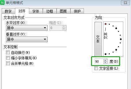 再点击【对齐】选项,将左侧的【方向】角度更改为“90°”;