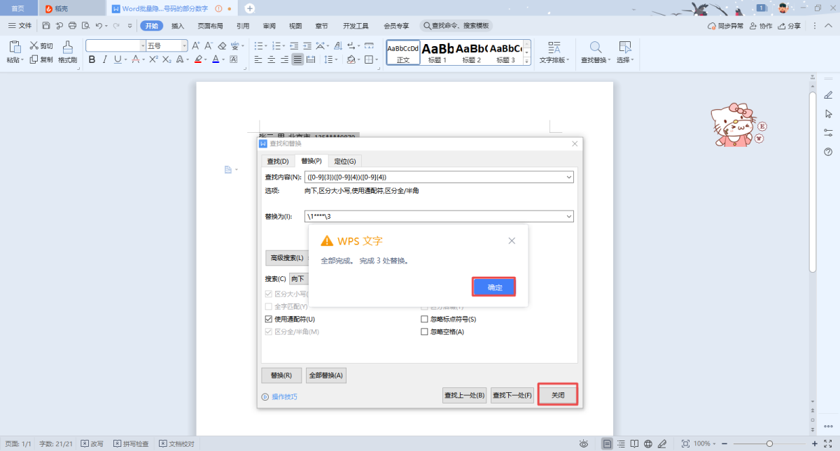 第八步,接着软件会弹出【全部完成。完成3处替换】的提示窗口,我们点击【确定】按钮,再点击【查找和替换】窗口的【关闭】按钮。