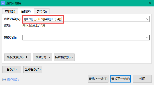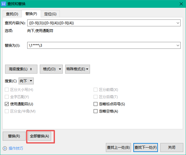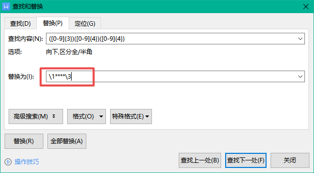 第四步,然后在【替换为】一栏中,我们输入【\1****\3】内容。