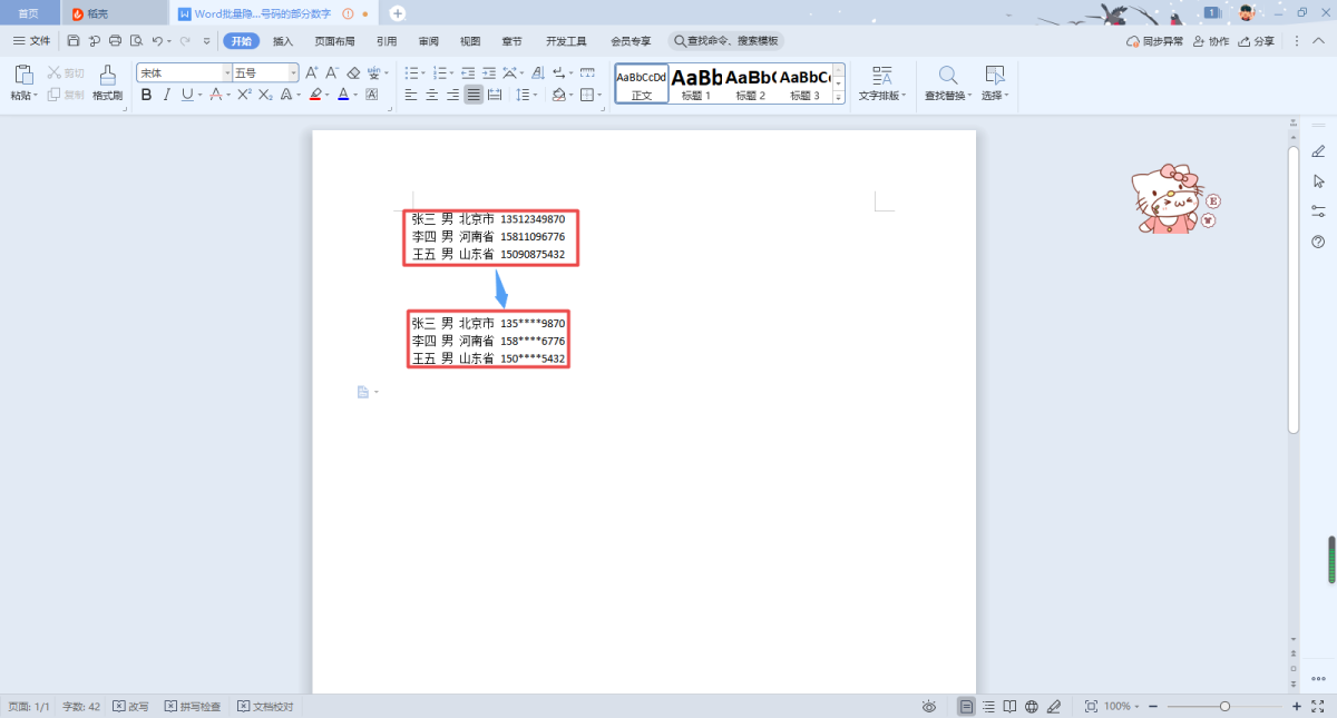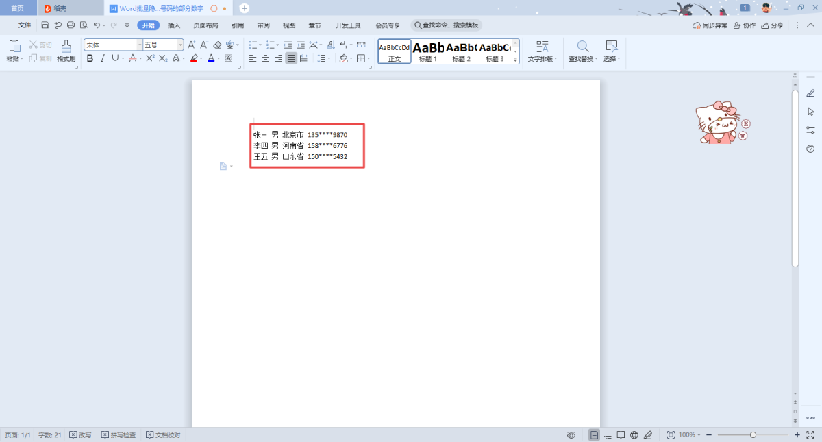 第九步,回到Word文档界面后,我们就可以看到,我们所选中的需要替换成星号的手机号码的部分数字就已经成功的被替换好了。