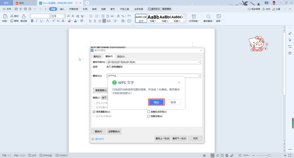 第七步,接着软件会弹出【已完成对当前选择范围的搜索,并完成3处替换。是否查找文档的其他部分?】的提示信息,如果还需要进行替换的话,就点击【确定】按钮,如果不需要替换文档其他内容部分中的手机号码了的话,就点【取消】按钮。