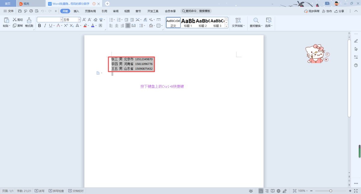 第二步,文档打开好以后,我们选中需要进行手机号码隐藏的区域,然后按下键盘上的【Ctrl+H】快捷键,来快速调出【查找和替换】的窗口。