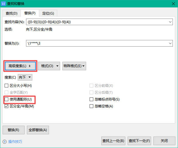 第五步,接着点击【高级搜索】按钮,然后勾选【使用通配符】选项。