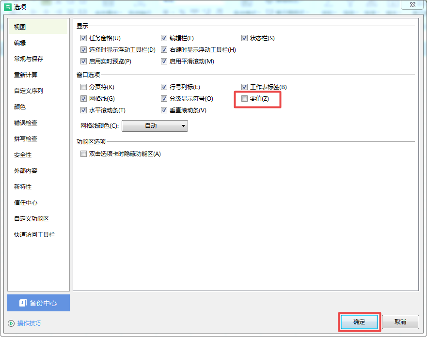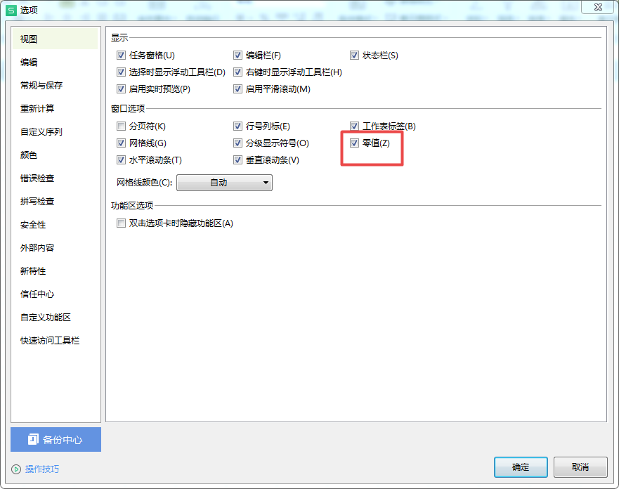 第四步,然后软件会弹出【选项】的设置窗口,并默认在【视图】选项下,此时我们找到窗口界面右侧的【零值】选项。