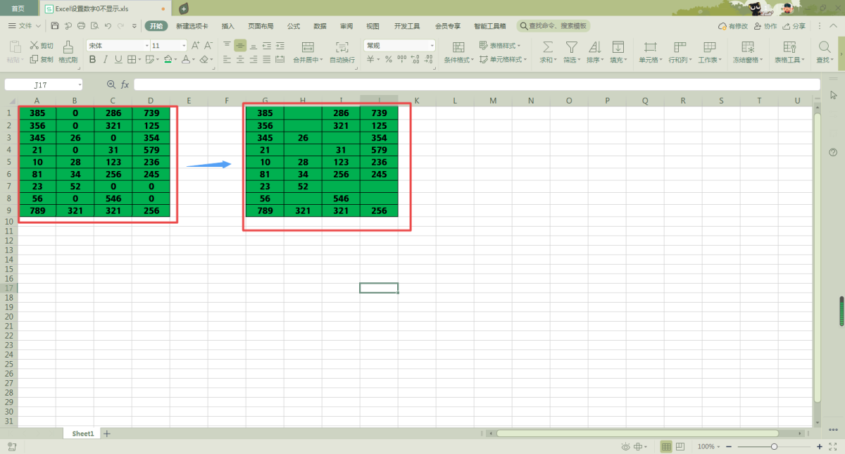 第六步,回到Excel工作表当中后,我们就可以看到,工作表当中的有0数据的单元格,就都不显示0的数据了。