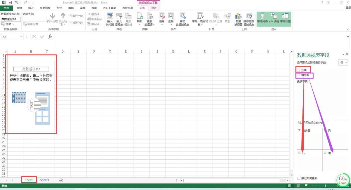 第四步,然后在表格中软件就会新建一个sheet工作表来放置新建的数据透视表了,此时我们在软件界面的右侧的【数据透视表字段】界面中,将【日期】拉倒下方的【行】小窗口中,再将【销售额】拉倒下方的【值】小窗口中。