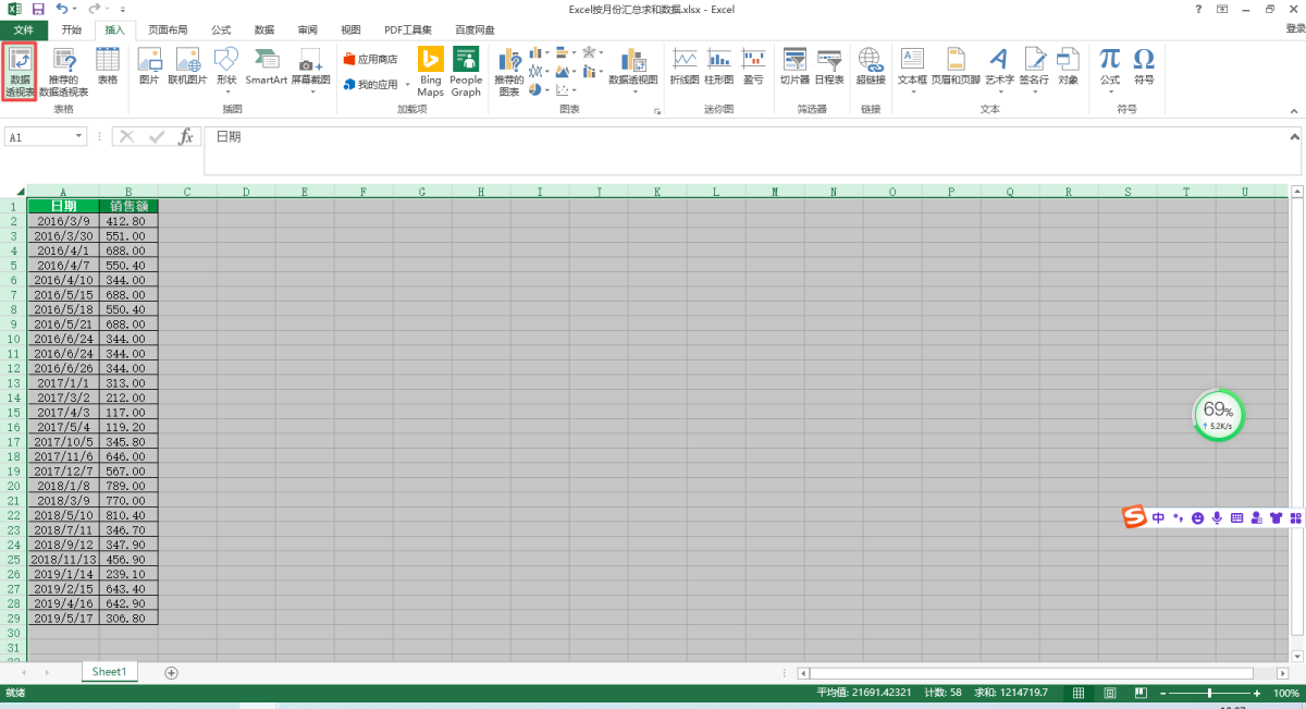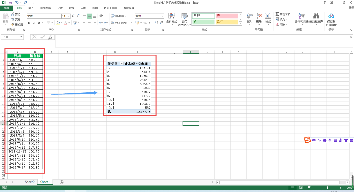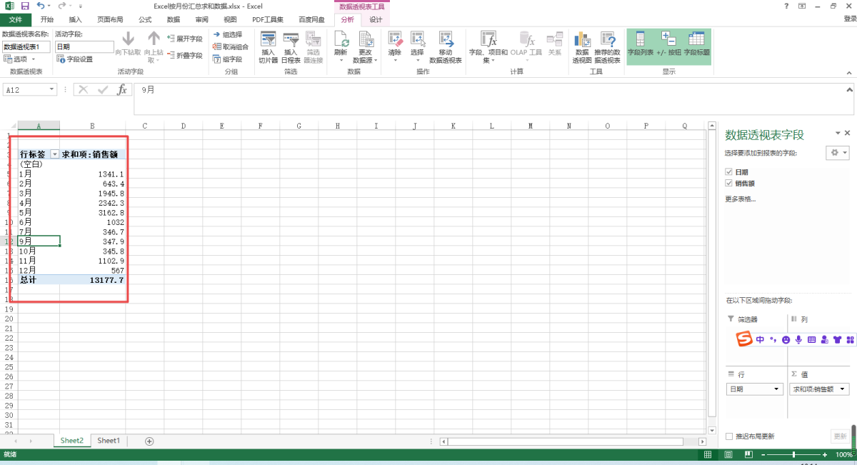 第九步,最后我们就可以获得数据按每月进行汇总求和的透视表了。
