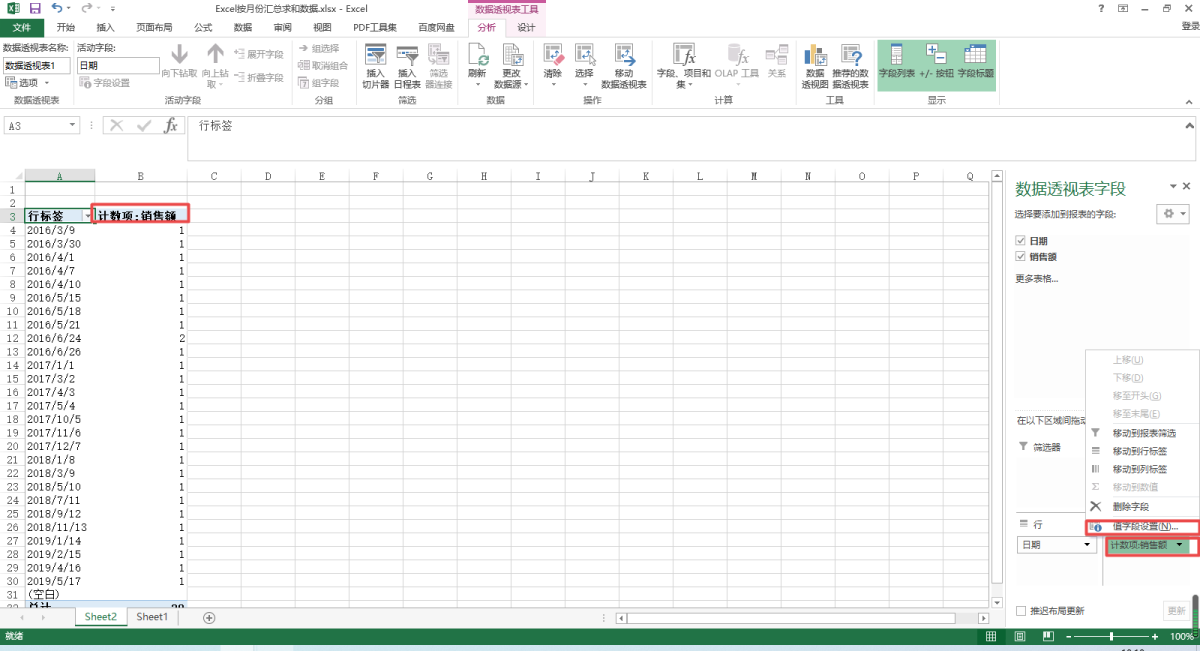 第五步,数据透视表的字段拖动好以后,我们在sheet2中就可以看到新创建的透视表了,不过此时的【销售额】是【计数项】,而不是我们想要的【求和项】,因此在软件右侧的【值】小窗口中,鼠标左键单击【销售额】选项,然后在弹出的选项中,选择【值字段设置】选项。