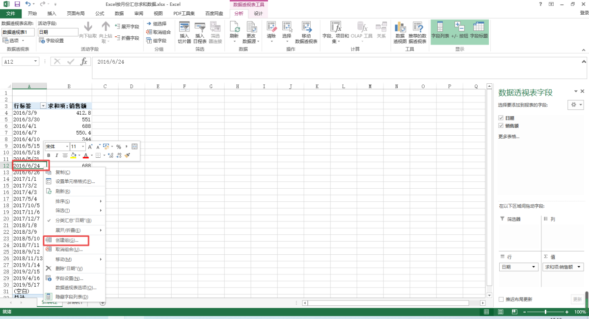 第七步,回到透视表中,我们就可以看到此时销售额是求和项了。紧接着,我们在【行标签】一栏中,选中任意一个日期,然后按下鼠标右键,在弹出的选项中选择【创建组】功能。