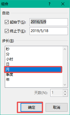第八步,然后软件就会弹出组合的设置窗口,此时我们在【步长】选项中选择【月】选项,然后点击【确定】按钮。