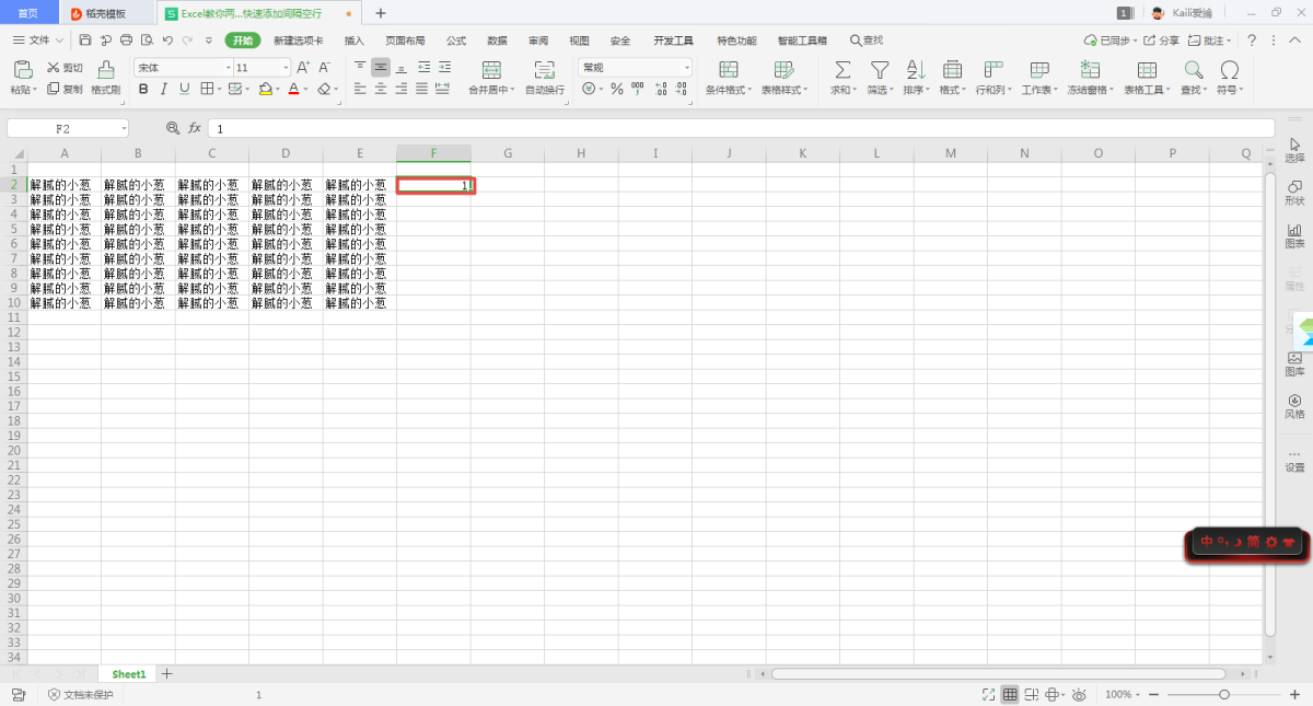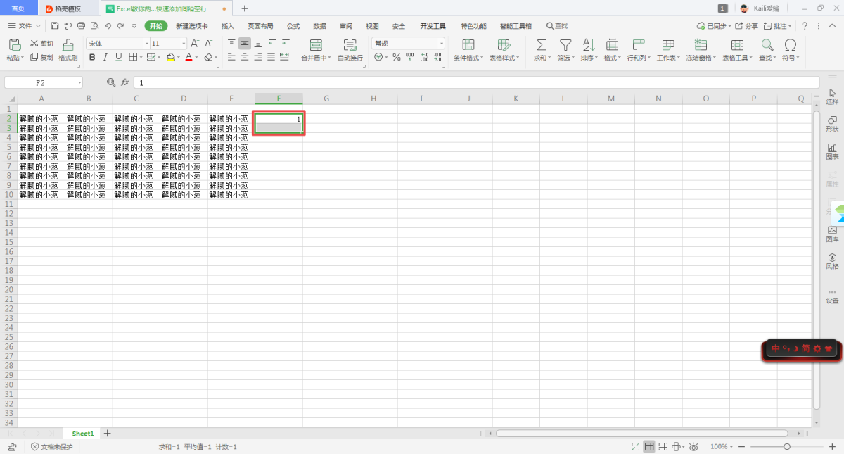 第二步,表格文档打开以后,我们首先需要在表格的右侧,需要一个辅助列,选中表格右侧的【F】空列,然后在【F2】单元格中输入数字【1】。