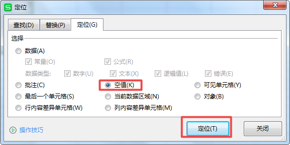 第五步,此时,就会弹出【定位】的窗口,我们在此窗口中,选项【空值】选项,然后点击【定位】按钮。