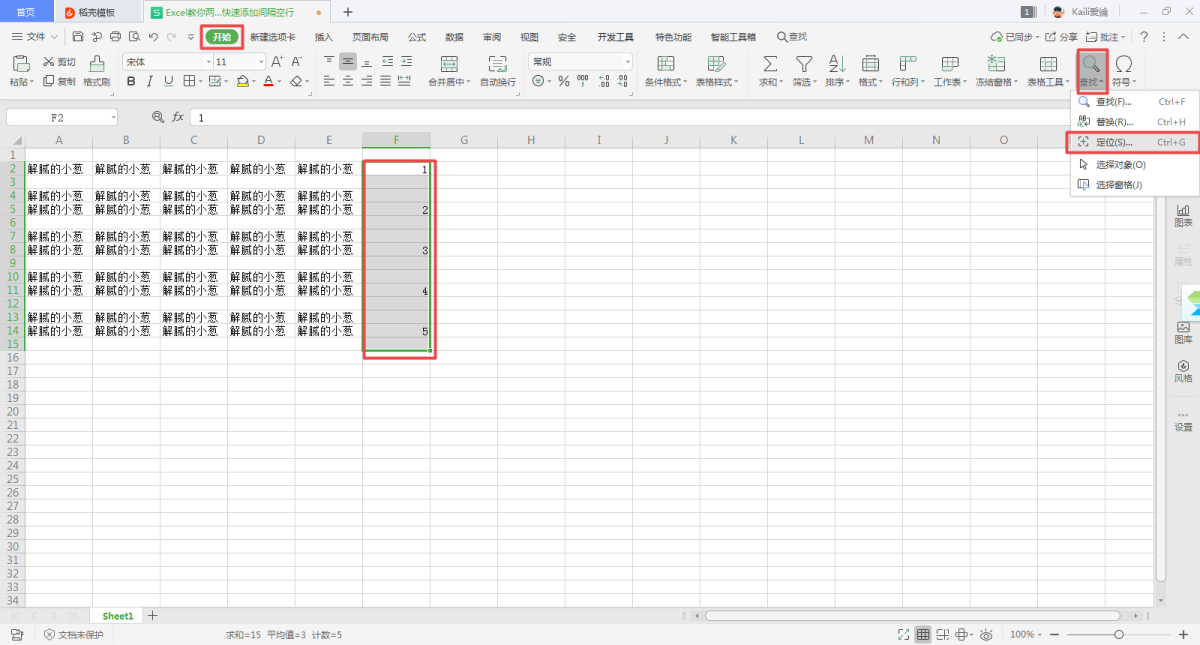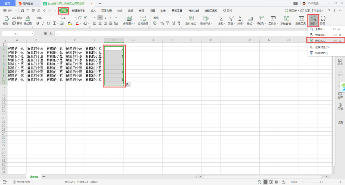 第八步,接着选中【F2】至【F15】,然后在【开始】选项卡中找到【查找】功能,接着点击,在弹出的选项中,选择【定位】功能。