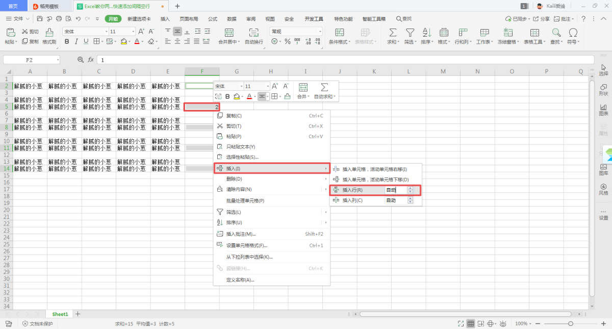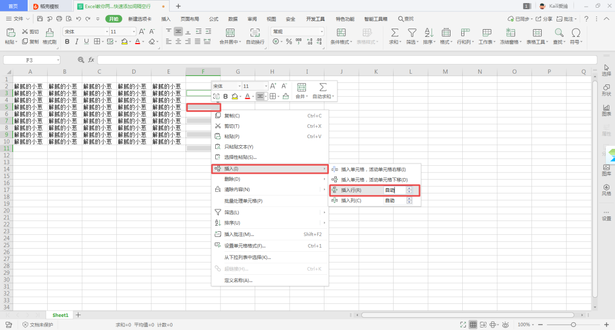 第十步,回到Excel表格界面后,我们还是不要在界面上单击鼠标的左键,保持现状,然后继续选择任意一个单元格,如【F5】,然后按下鼠标的右键,在弹出的选项中选择【插入】功能下的【插入行】功能。