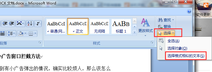 第一步,选中一个要拆分的文本节点,点击“选择”,下面点击“选择格式相近的文本”,所有要拆分的文本节点就都被选中了。