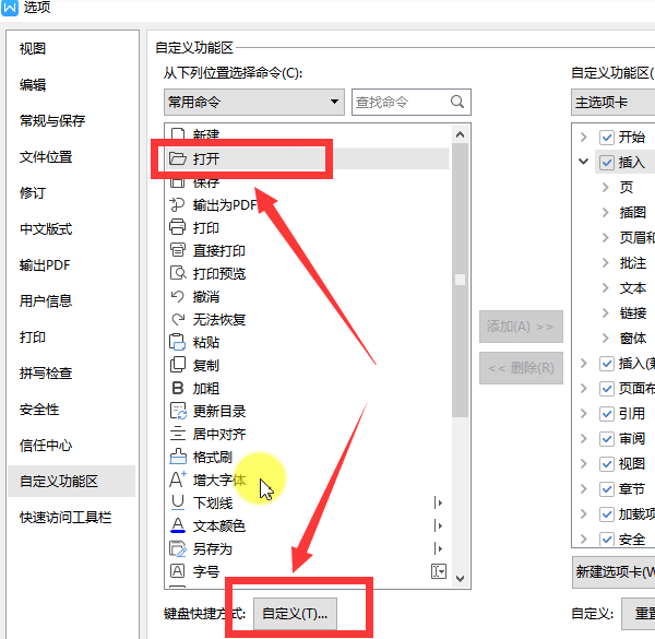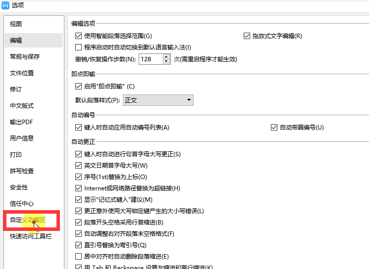 第二步,在【选项】页面中,点击左侧的【自定义功能区】选项卡。