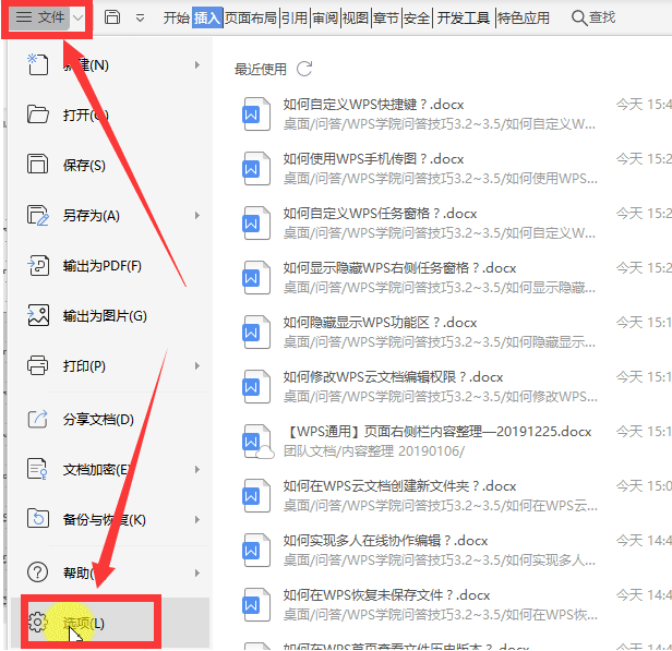 第一步,随便打一个WPS文档,点击左上角的【文件】下拉菜单里的【选项】。