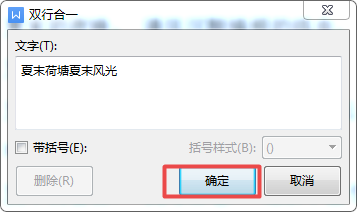 第四步,然后软件就会弹出【双行合一】的对话框,此时我们可以根据自己的需要,来选择是否带括号,如果不带的话,就直接点击【确定】按钮。