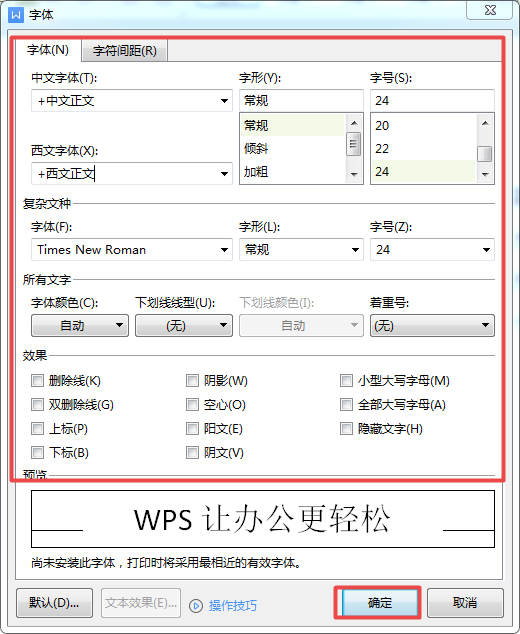 第七步,接着软件会弹出【字体】的设置窗口,在此窗口当中,我们可以对刚刚设置好的双行合一的文字设置字体、字号、或者是加入一些装饰等,全部设置好以后,点击窗口下方的【确定】按钮。