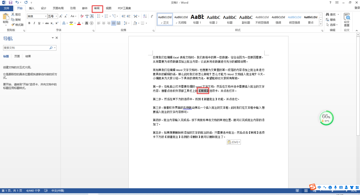 第一步,在电脑上打开需要处理的word文字文档,然后在文档中选中需要插入批注的文字内容,接着点击软件顶部工具栏上的【审阅】选项卡,并点击打开。