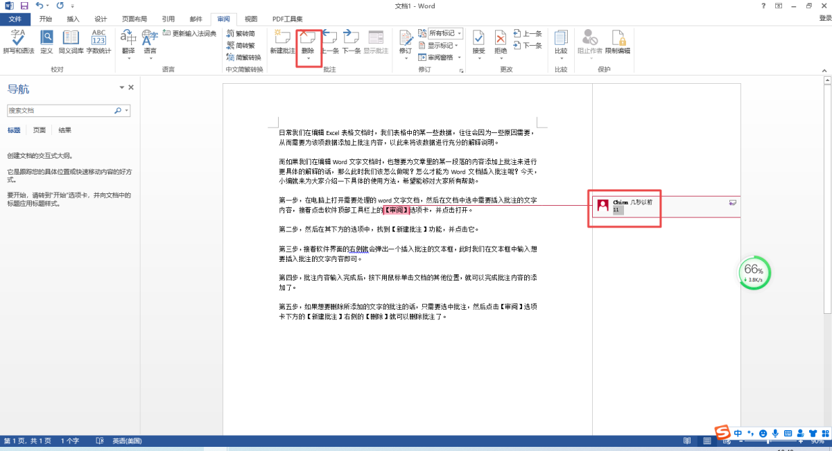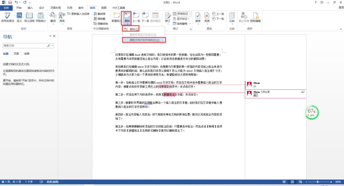 第五步,如果想要删除所添加的文字的批注的话,只需要选中批注,然后点击【审阅】选项卡下方的【新建批注】右侧的【删除】选项下的【删除】功能,如果文档中有多个批注的话,我们还可以通过直接选择【删除文档中的所有批注】,来将文档中的所有批注进行删除即可。