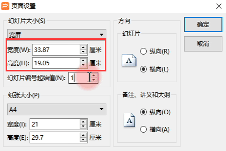 第三步,在【页面设置】对话框中,有多种幻灯片大小的预设尺寸供大家选择,亦可以手动对幻灯片的长宽进行修改,直接输入幻灯片大小数值即可。