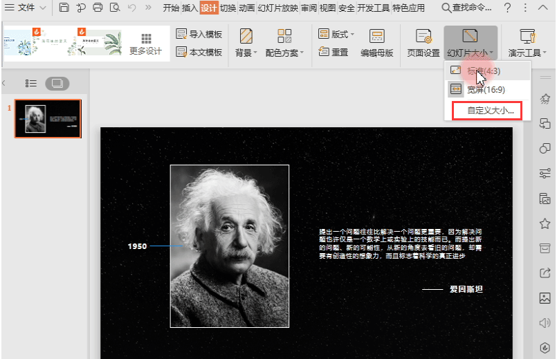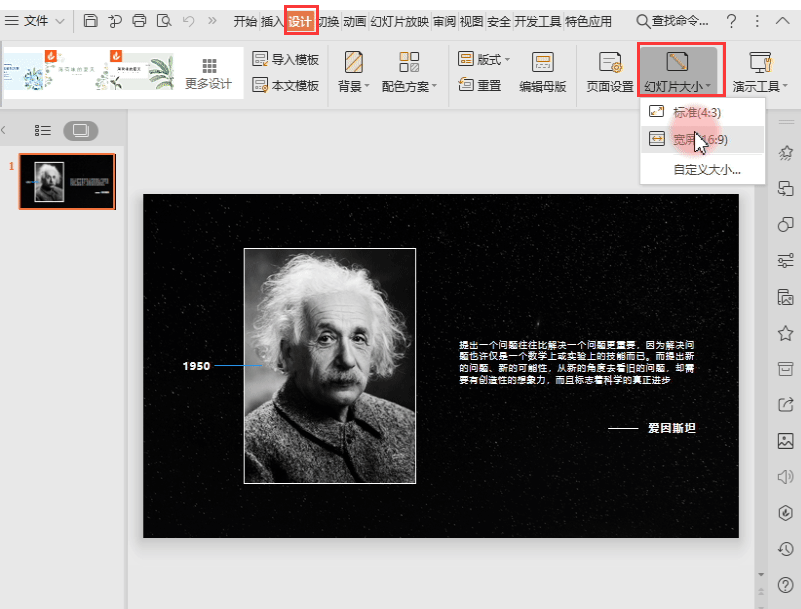 第一步,在PPT幻灯片页面上方菜单栏中,点击【设计】选项,然后找到并点击【幻灯片大小】选项的【下拉按钮】,在这里可以选择幻灯片的尺寸,有【4:3】的标准尺寸和【16:9】的宽屏尺寸可以选。