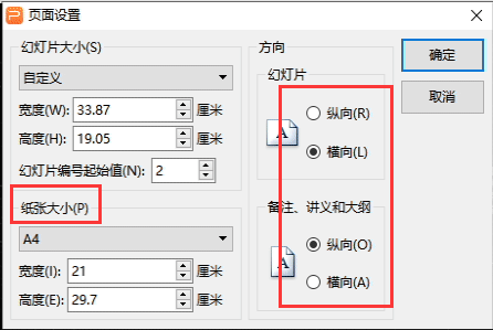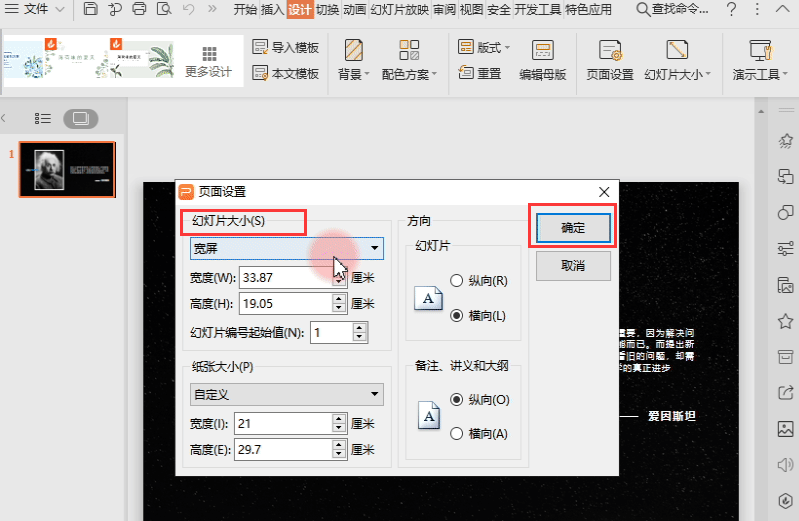 第五步,设置幻灯片的【纸张大小】,纸张大小指的是幻灯片在打印的时候所需要的的【纸张页面大小】。在【页面设置】处,还可以对幻灯片的【横向】和【纵向】以及打印纸张的大小以及横纵向进行设置,设置完成后,也是点击右边的【确定】就可以了。