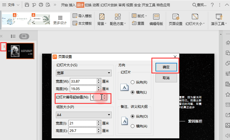 第四步,设置幻灯片的【起始值】,一般默认的情况下,幻灯片的起始编号为【1】。如果需要改动的话,只需要在【页面设置】对话框中的【幻灯片编码起始值】处更改数字即可,最后点击右边的【确定】。