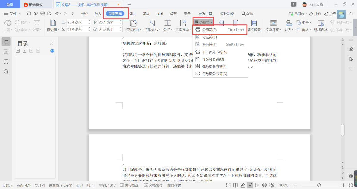 除了上面最笨的多按Enter键以及Ctrl+Enter快捷键的方法外,我们还可以通过新建分页符的方式来换到下一页当中。