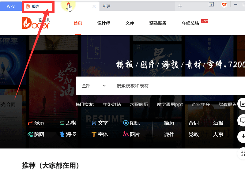 第一步,打开WPS办公软件,并点击进入【稻壳】页面。