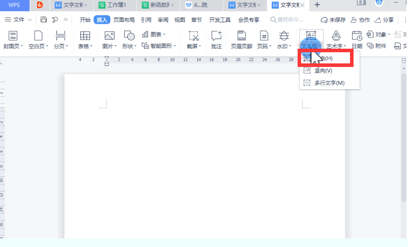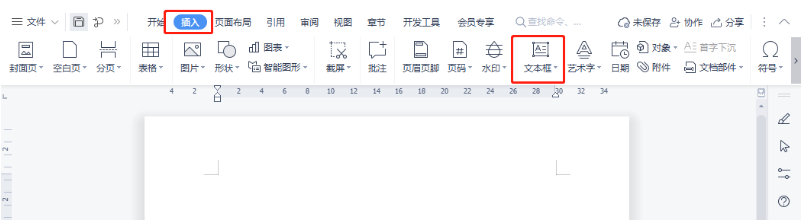 第一步,在WPS中打开一个空的Word文档,点击【插入】下面的【文本框】选项,在文档中插入一个文本框。