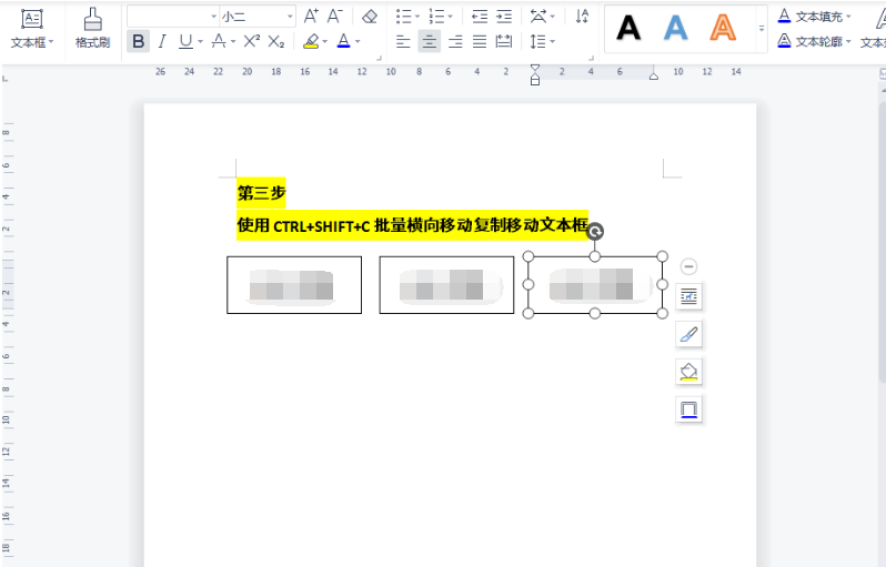 第三步,文本框中的内容填写好之后,选中该文本框,在键盘上按快捷组合键【CTRL+SHIFT+C】即可批量横向移动复制。