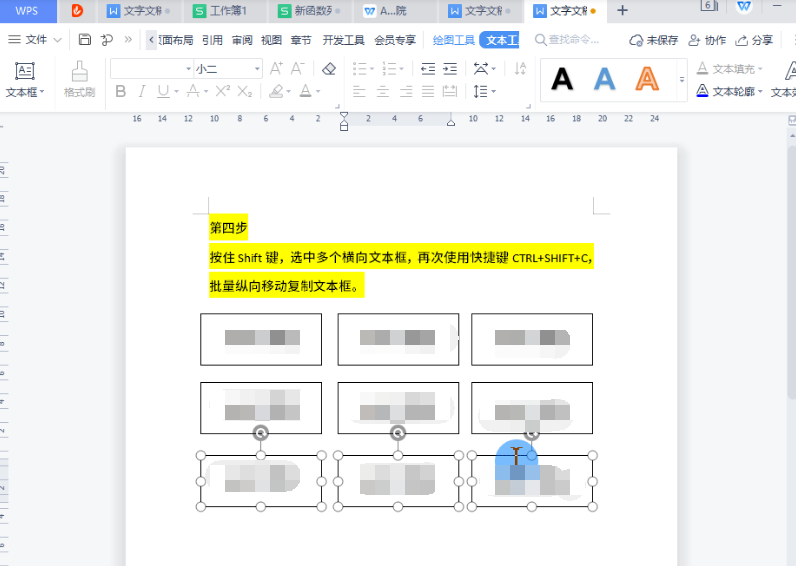 第四步,按住【SHIFT】键,连续选中这一整行的文本框,然后再按【CTRL+SHIFT+C】就可以批量纵向移动复制这一整行的标签。