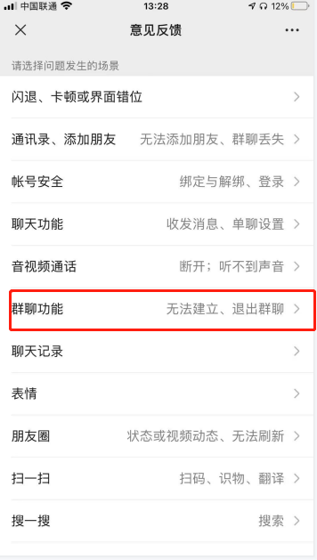 5. 进入到意见反馈的界面后,点击群聊功能,无法建立,退出群聊。